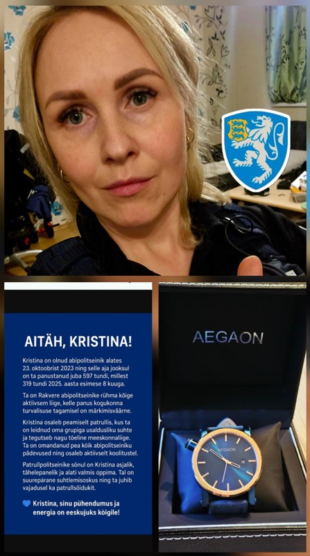 Tõepoolest – Kristina on alates 2023.aasta sügisest abipolitseinike ridades ja sai hiljuti suure tunnustuse osaliseks. „Mind tunnustati selle eest, et olen olnud väga aktiivne ja pühendunud abipolitseinik. Olen abipolitseinik alates 23.10.2023 ning selle ajaga olen panustanud kokku ligi 600 töötundi (seisuga oktoober 2025 – toim), mis viis mind Rakvere abipolitseinike rühma kõige aktiivsemaks abipolitseinikuks,“ on tublil patrullis käijal hea meel. „Abipolitseinikuks saama innustas mind soov panustada kogukonna turvalisusesse – politseitöö on mulle alati meeldinud ja tahan inimesi aidata. Samuti pakub see mulle võimalust näha erinevaid olukordi ja inimeste elusid, millest ise palju õpin. Abipolitseiniku töö annab mulle väärtuslikku kogemust, enesearengut ja võimaluse teha midagi olulist teiste heaks,“ selgitab Kristina. Politseitööst ei meenu talle hetkel ühtki ägedat või naljakat seika. „Enamik väljakutseid on seotud tõsiste ja keeruliste olukordadega. Pigem on mind mõjutanud see, kui palju erinevaid inimesi ja elulisi olukordi ma olen patrullis olles näinud ning kui palju olen sellest ise õppinud. Muidugi ei tule koos patrullikaaslastega töötades huumorist puudust, aga sellise elukutse puhul on huumor hädavajalik,“ leiab ta.